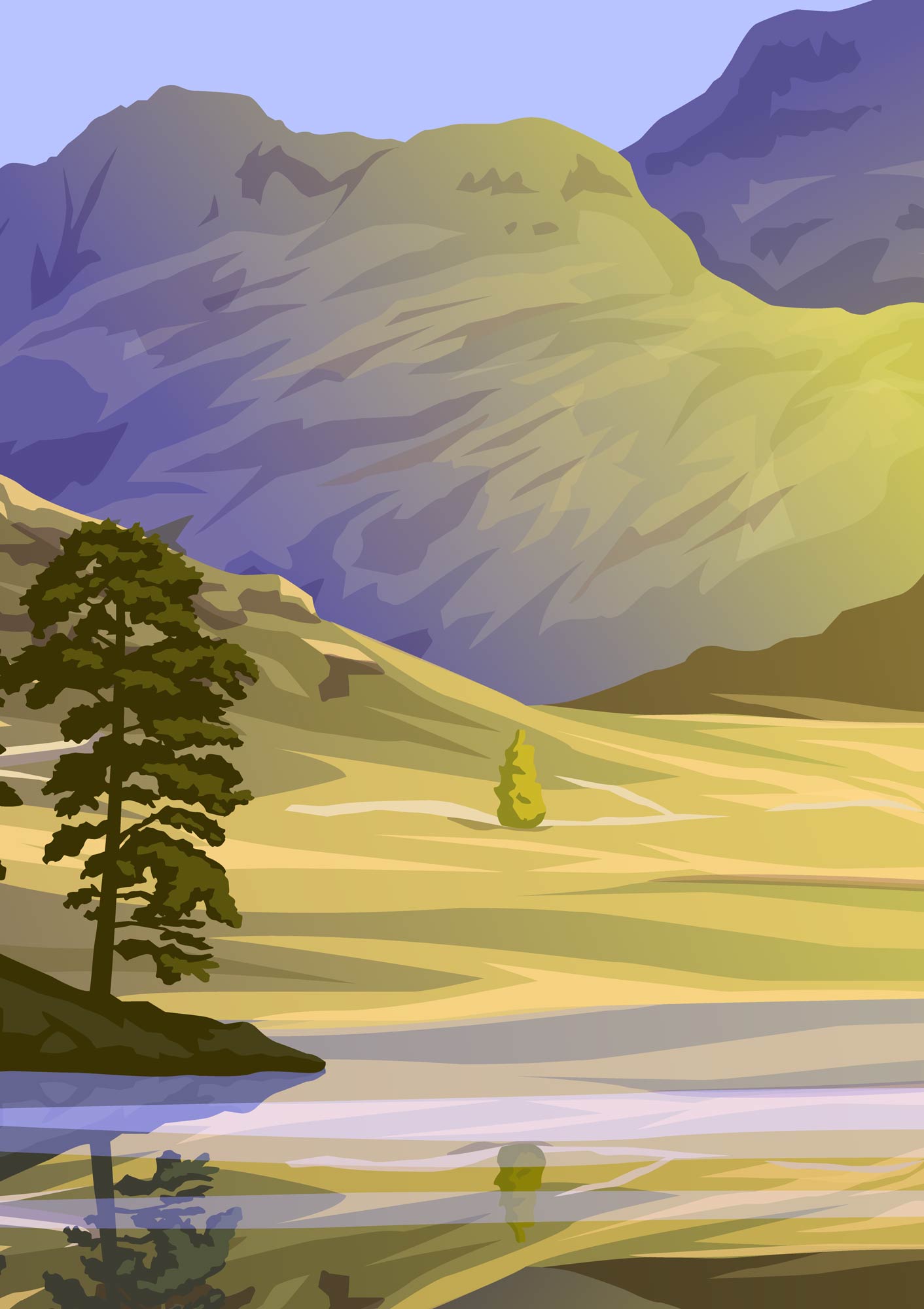 Created by digital artist Stephen Millership, this vintage style graphical illustration of Blea Tarn uses subtle colour and tone to create a serene lake district scene. Featuring a description of Blea Tarn by William Wordsworth from his book 'A Guide through the District of the Lakes' first published in 1810.