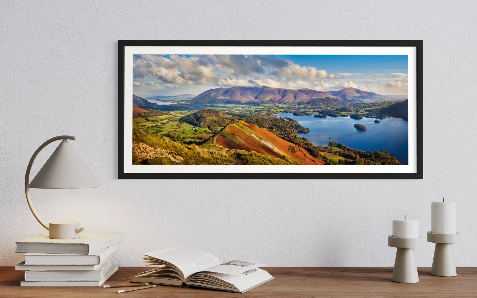 This colourful print features an impressive view along the spine of Cat Bells over Keswick to Skiddaw.