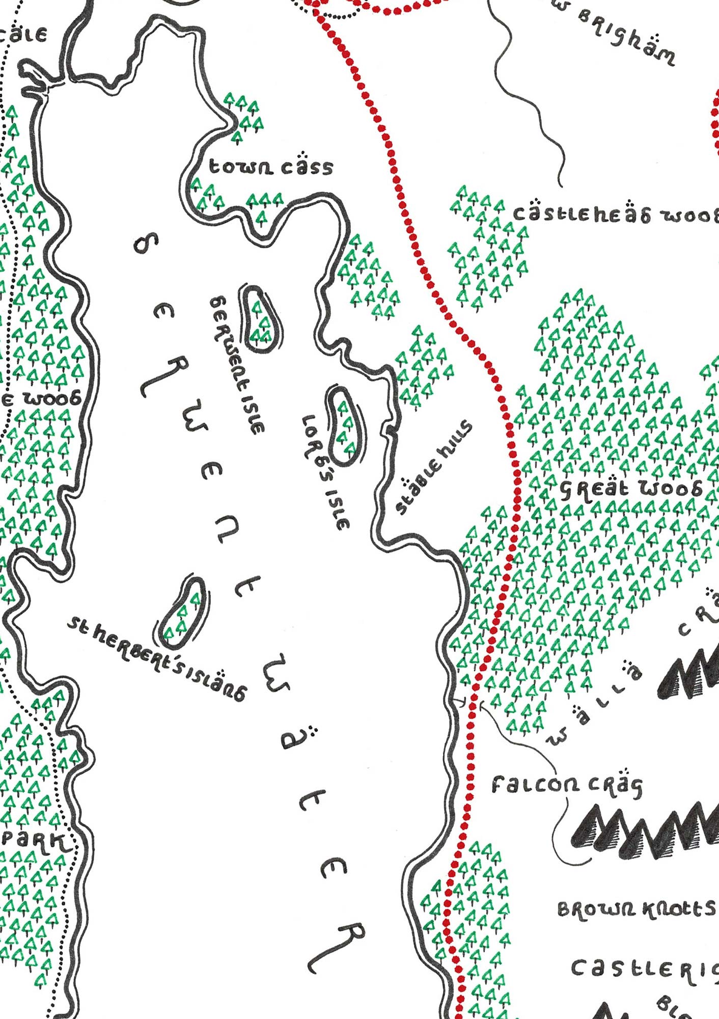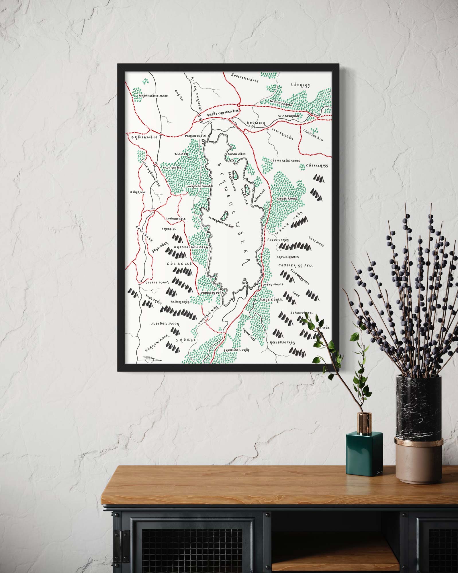 Creatively depicted by Lake District based artist Dan Bell, reproduced from his original hand drawn pen and ink map with a fantasy theme and a splash of colour.