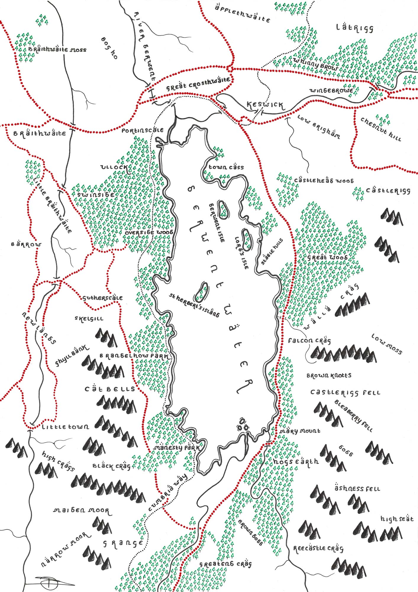 Unique stylized map of the Lake District's Derwent Water lake and surrounding area. Just south of Keswick, Derwent Water is the third largest lake by area, after Windermere and Ullswater. The map shows the full expanse of this impressive 4.6 kilometres long lake.