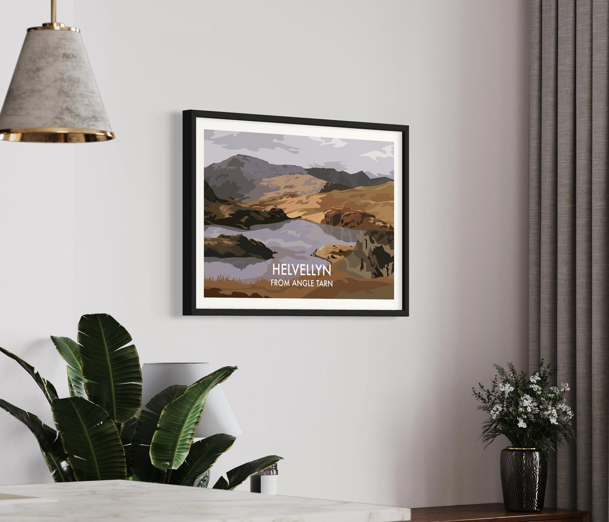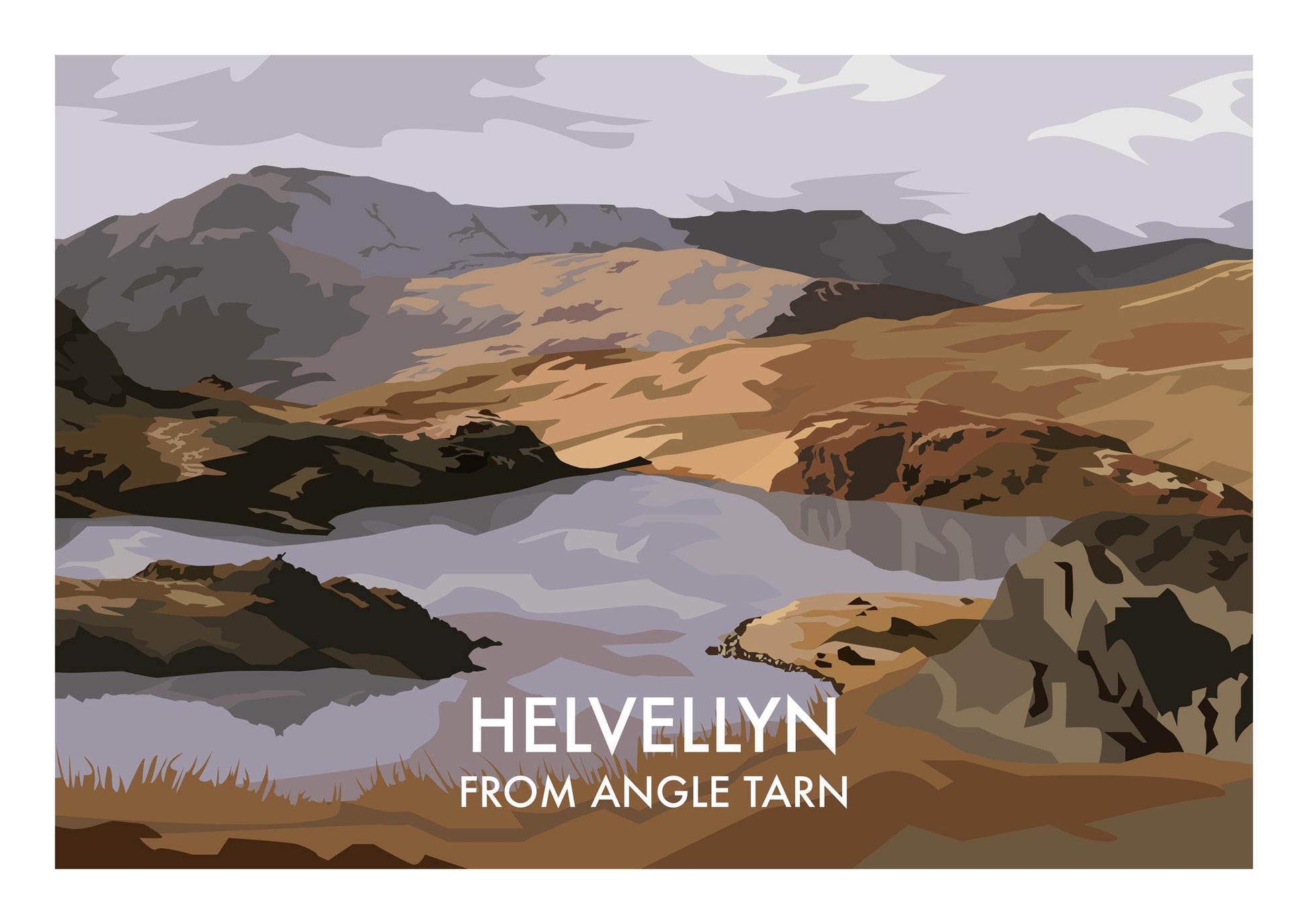 This vintage style graphical illustration depicts the impressive Helvellyn mountain range, as seen from Angle Tarn in the Lake District. In subtle autumnal tones, the water looks tranquil against the mountainous backdrop.
