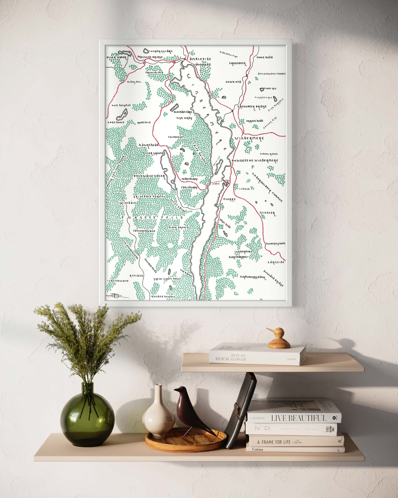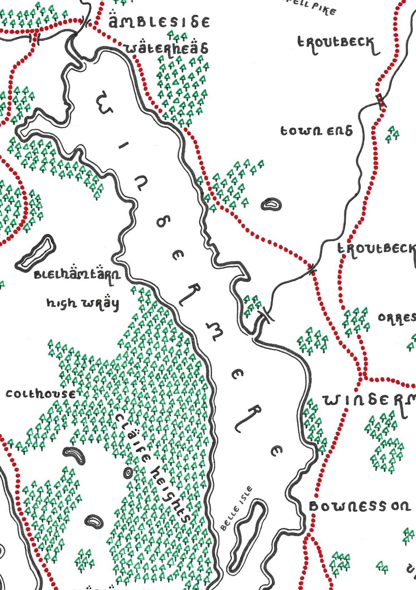 Unique stylized map of the Lake District's Lake Windermere and surrounding area. The map shows the full expanse of this impressive lake, the largest in England at 10.5 miles long (18 km).