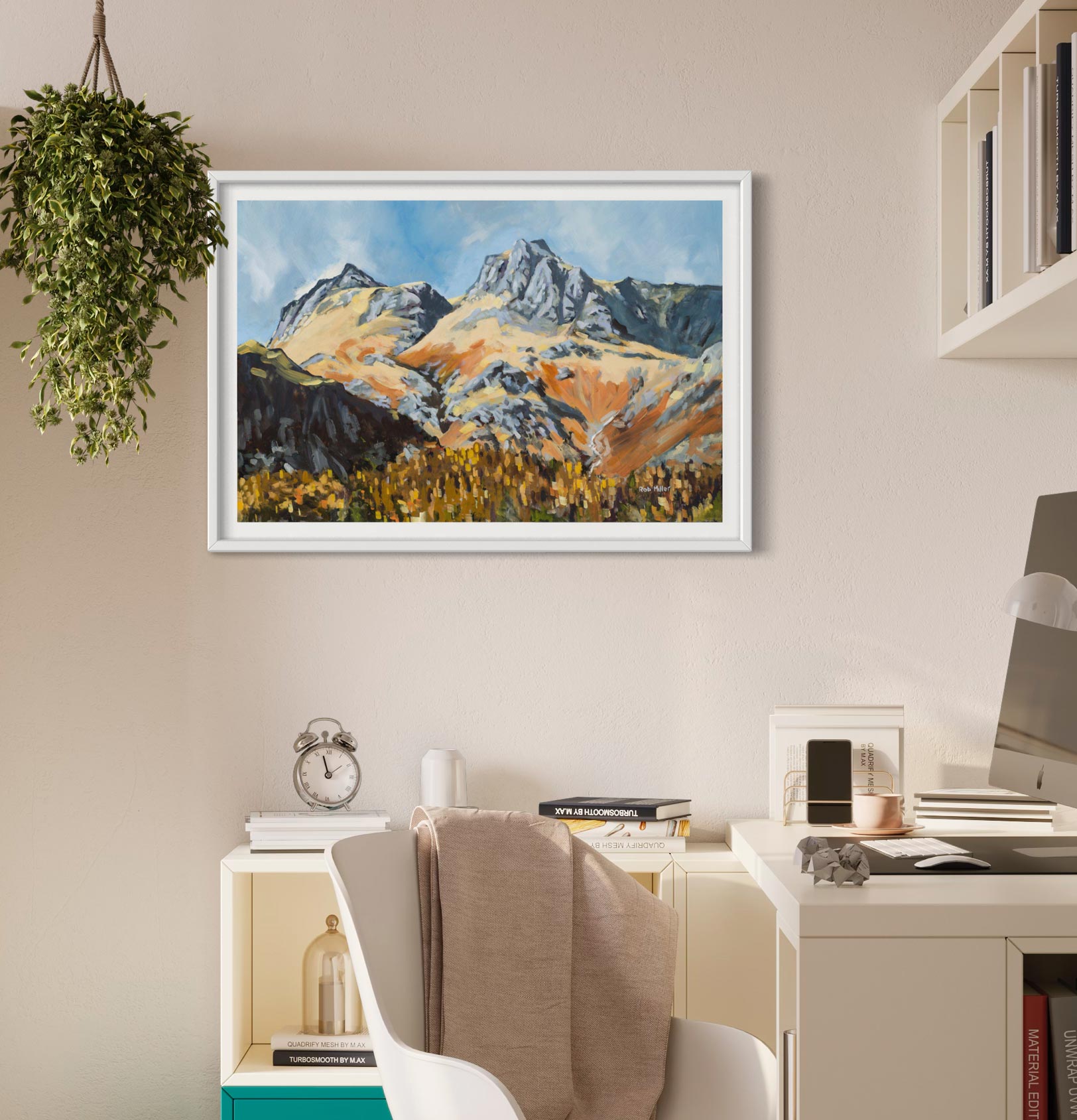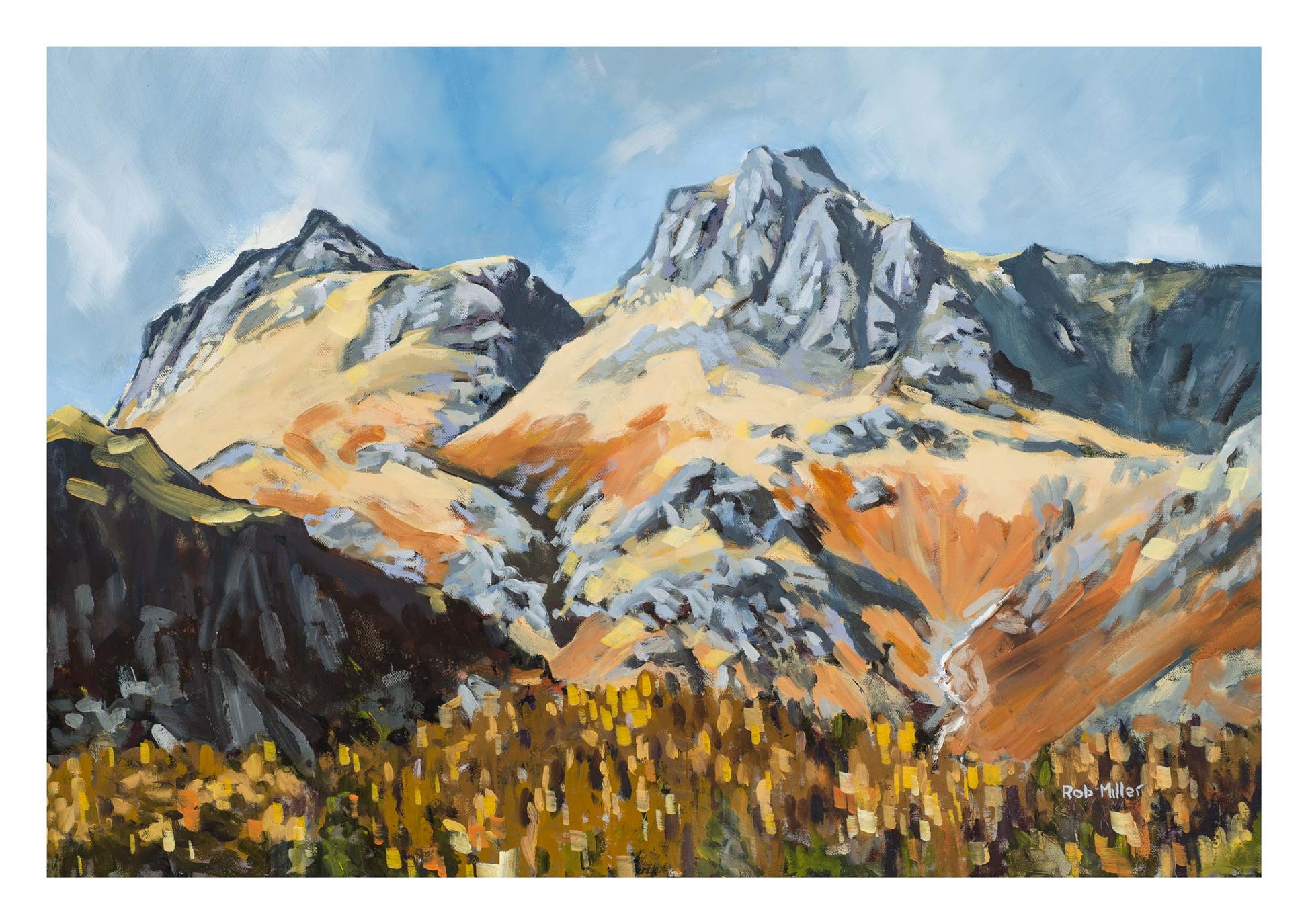 ‘Langdales Pike Autumn’ shows the picturesque series of peaks within Great Langdale, beautifully captured in this painting by local landscape painter Rob Miller. Pictured on an autumn’s day with bold, warm colours this is an impressive lake district scene.