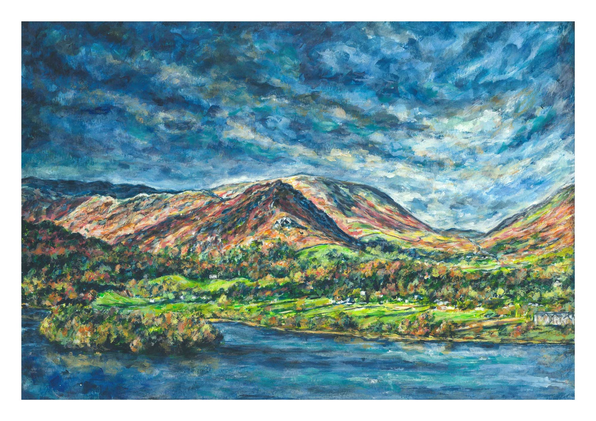 This beautiful Lake District painting by Ted Hepenstal perfectly captures the beauty of  the Helm Crag and of the moddy skies above. The movement of the paint strokes makes you believe you can almost feel the strong winds pushing the moddy clouds around the beautiful landscape below.