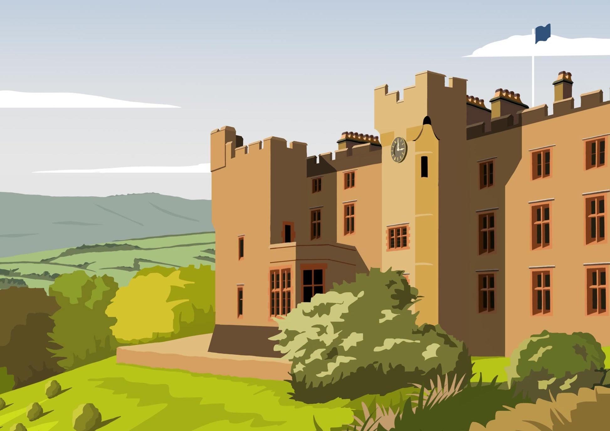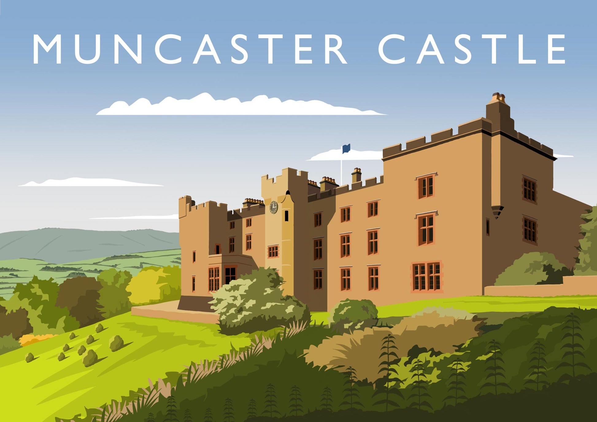 Contemporary travel poster style illustration of Muncaster Castle, overlooking the River Esk in the western Lake District. This historic castle was originally built in the 13th century and is known as one of Britain's most haunted castles.