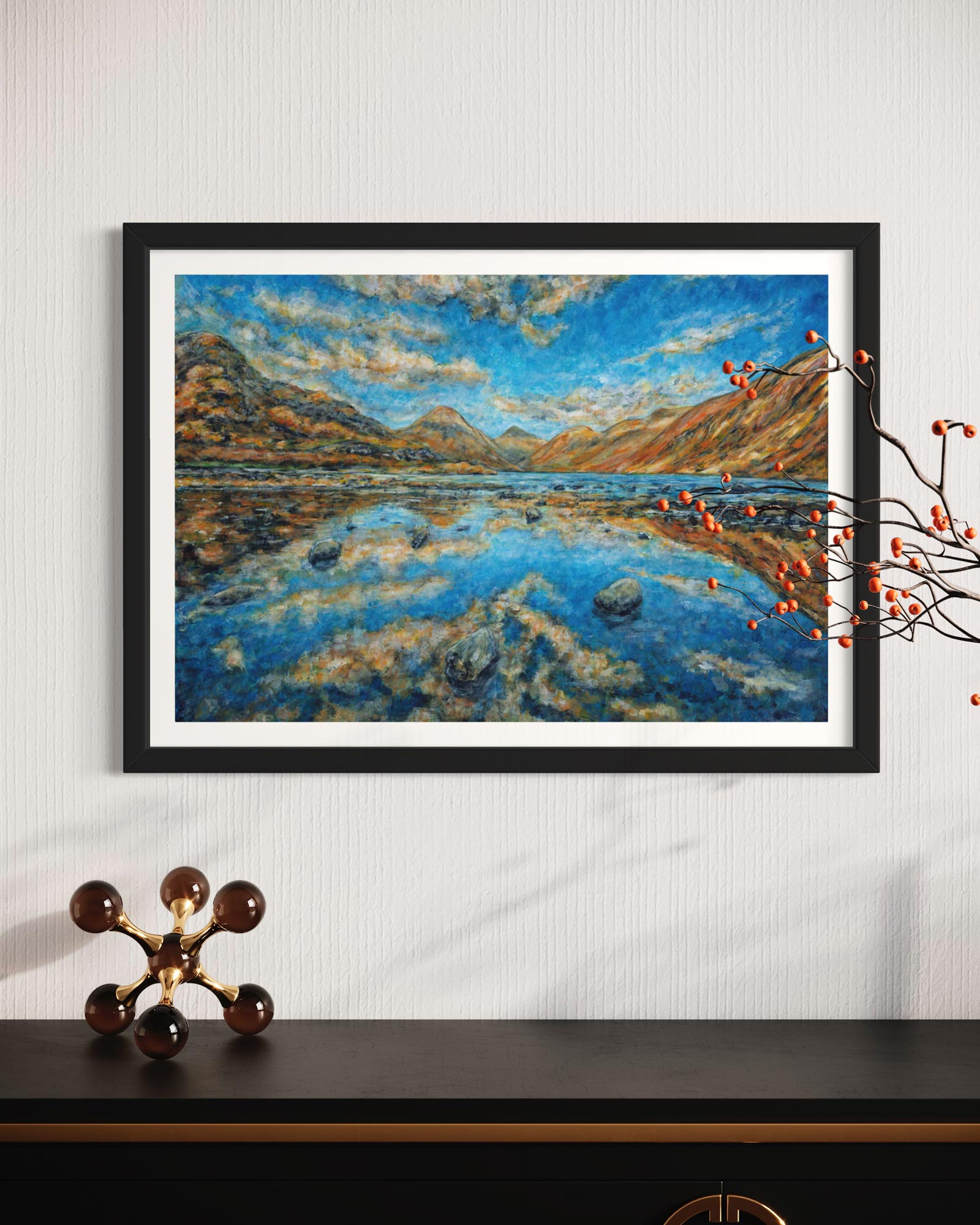 This beautiful Lake District painting by Ted Hepenstal perfectly captures Wast Water, the England's deepest lake located in the Lake District. Ted beautifully captured the dramatic landscape and rugged countryside of Wasdale. The contrast of the warm tones of oranges and browns of the hills is spectacular in contrast to the cyan blue of the sky, and its reflection in the lake below.