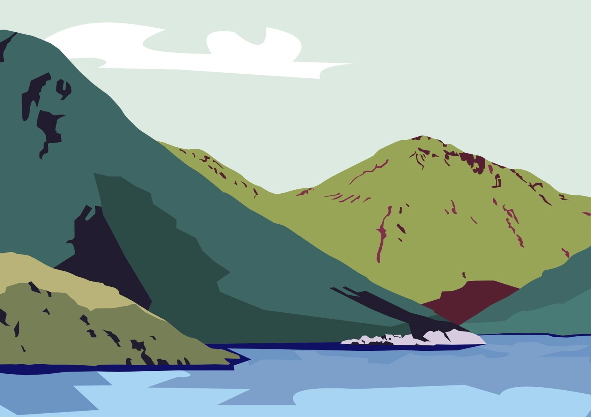 Created in a vintage travel poster style, this bold colourful image features Wastwater in the Lake District. Situated in Wasdale Valley, Wastwater is one of the deepest lakes in England at 260 feet deep. The image captures the vast 3 mile long lake and dramatic mountainous backdrop.